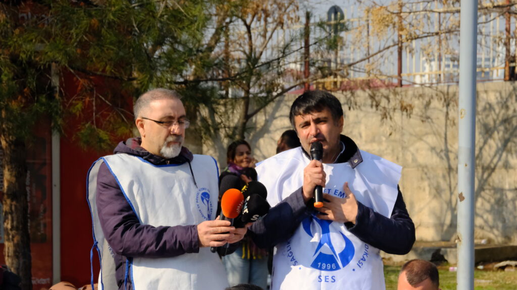 Hevserokê Sendîkaya Kedkarên Tenduristiyê (SES) a Amedê Mehmet Nûr Ulus bal kişand girîngiya pêkanîn û girîngiya xizmetên tenduristiyê û wiha axivî: “Ji bo mafê jiyanê em têkoşîna xwe dimeşînin. Dema erdhej çêbû, em li qadê bûn, em di nav gel de bûn. Dema şer çêbû, em li qadê bûn. Em ji bo Kobanê jiyanê biparêzin.”