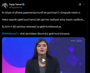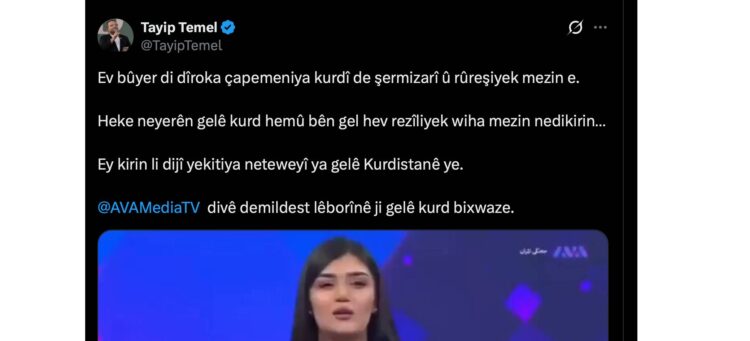 Cîgirê Hevserokê DEM Partiyê Tayîp Temel bertek nîşanî sansurkirina wêneyê Rêberê Geê Kurd Abdullah Ocalan da û got, “Ev kirin li dijî yekitiya neteweyî ya gelê Kurdistanê ye. @AVAMediaTV divê demildest lêborînê ji gelê kurd bixwaze.”
