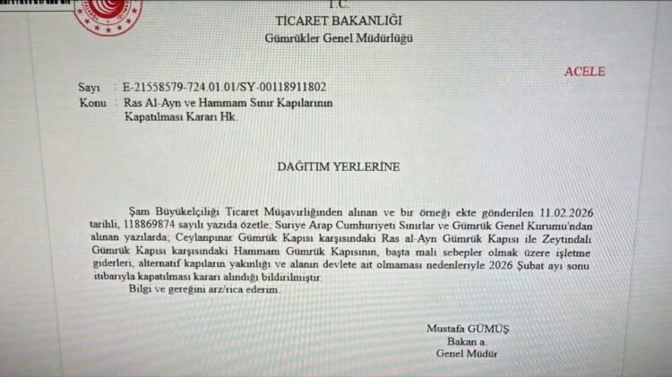 Di demek geşedanên girîng li Sûriyê çê dibin de Tirkiyê biryarek balkêş da. Hate zanîn ku Wezareta Bazirganiyê ya Tirk, Deriyê Sînor ê Serêkaniyê û Deriyê Sînor ê Hemamê ku dikeve herêma Efrînê bi tevahî ji hatinûçûyînê re girt. Di nivîsa ku ji saziyên dewletê re bi sernava, ‘lezgîn’ hatiye şandin de wiha tê gotin: “Li gorî nivîsa bi dîroka 11.02.2026an ku ji Şêwirmendiya Aborî ya Sefareta Şamê hatiye girtin û nivîsên ji Saziya Giştî ya Kûrik û Deriyên Sînor a Komara Sûriyê hatine girtin ji ber lêçîyînên aborî û hebûna deriyên alternatîf biryara girtina Deriyê Sînor ê Serêkaniyê û Deriyê Sînor ê Hemamê bên girtin. Dê di dawiya sibatê de hatinû çûyîna deriyan bê rawestandin û derî bi temamî bên girtin.”