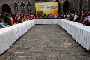 Em jinên ku di têkoşîna civakîbûna aştiyê de rolekepêşeng girtine ser milê xwe, em ê îro jî wekî duh li meydanan ji bo serkeftina vê pêvajoyê, ji bo azadiya fîzîkî ya Rêberê Gelê Kurd Birêz Abdullah Ocalan ku yek ji aktorên sereke yên pêvajoyê û ji bo ku pêvajoya aştiyê bi civakeke demokratîk ve were avakirin, em ê li qadan bin. Ji ber ku em jin dizanin ku bêyî misogerkirina azadiya jinan ti aştî namîne û civakeke demokratîk tenê bi berxwedana rêxistinkirîya jinan dikare bi rastî pêk were.”