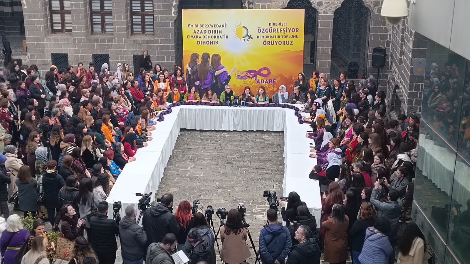 Tevgera Jinên Azad (TJA) bi dirûşma “Em bi berxwedanê azad dibin, civaka demokratîk dihûnin” li Qonaxa Cemîl Paşa ya li navçeya Sûrê ya Amedê deklerasyona 8ê Adarê aşkere kir. Parlamenterên DEM Partiyê, hevşaredar, endam û rêveberên partiyên siyasî û nûnerên saziyên sivîl ên civakî din av de gelek jin tev li daxuyaniyê bûn. Gelek jin bi cil û bergên Kurdî beşdarî daxuyaniyê bûn. Di daxuyaniyê de pankarta bi Kurdî û Tirkî li ser “Em bi berxwedanê azad dibin, civaka demokratîk dihûnin” dinivîsî hate daliqandin. Metna daxuyaniyê ya bi zaravayê kurmancî yê Kurdî aktîvîsta TJAyê Ayşegul Ayaz û metna bi Tirkî jî aktîvîsta TJAyê Sebahat Tûncel xwend.