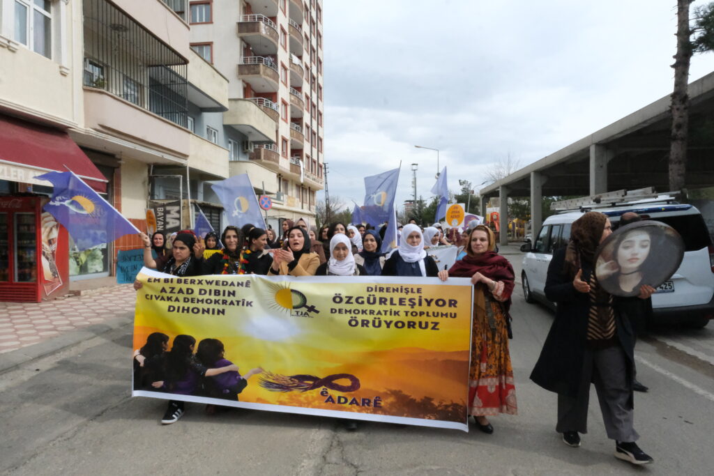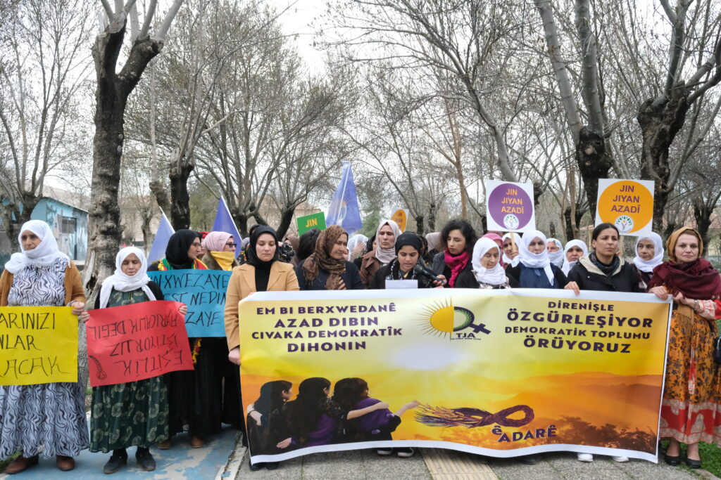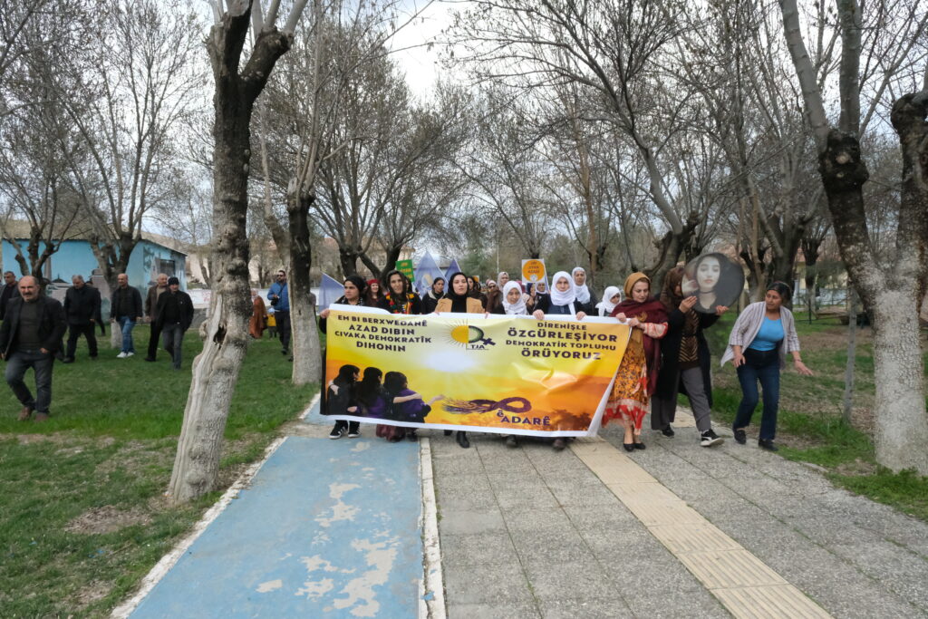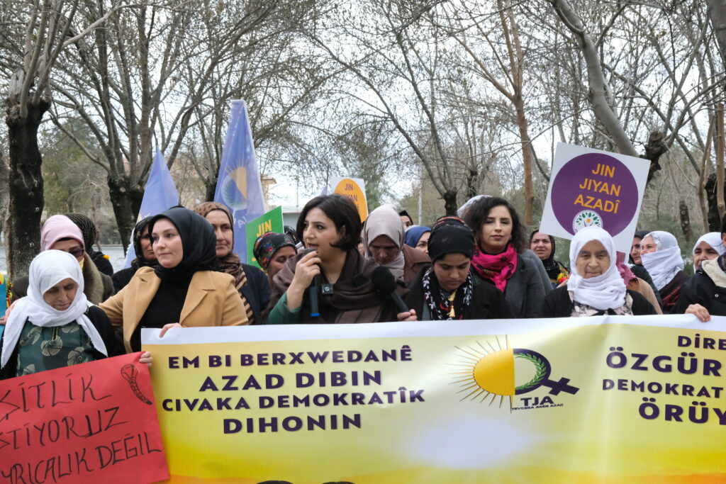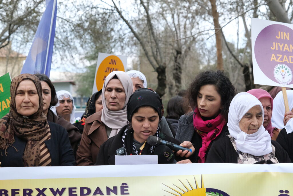 Tevgera Jinên Azad (TJA) li Parka Berfînê ya navçeya Misircê ya Sêrtê di çarçoveya çalakiyên 8ê Adarê Roja Jinan a Cîhanê de bi dirûşma “Bi berxwedanê azad dibin, civaka demokratîk ava dikin” daxuyaniyê dide. Parlamentera DEM Partiyê ya Sêrtê Sabahat Saritaş Erdogan, endam û rêveberên partiyên siyasî û saziyên sivîl ên civakî û gelek jin tev li daxuyaniyê bûn. Di daxuyaniya ku pankartê “Bi berxwedanê azad dibin, civaka demokratîk ava dikin” hate vekirin de metna daxuyaniyê aktîvîsta TJAyê Devrîm Keklîk dixwîne.