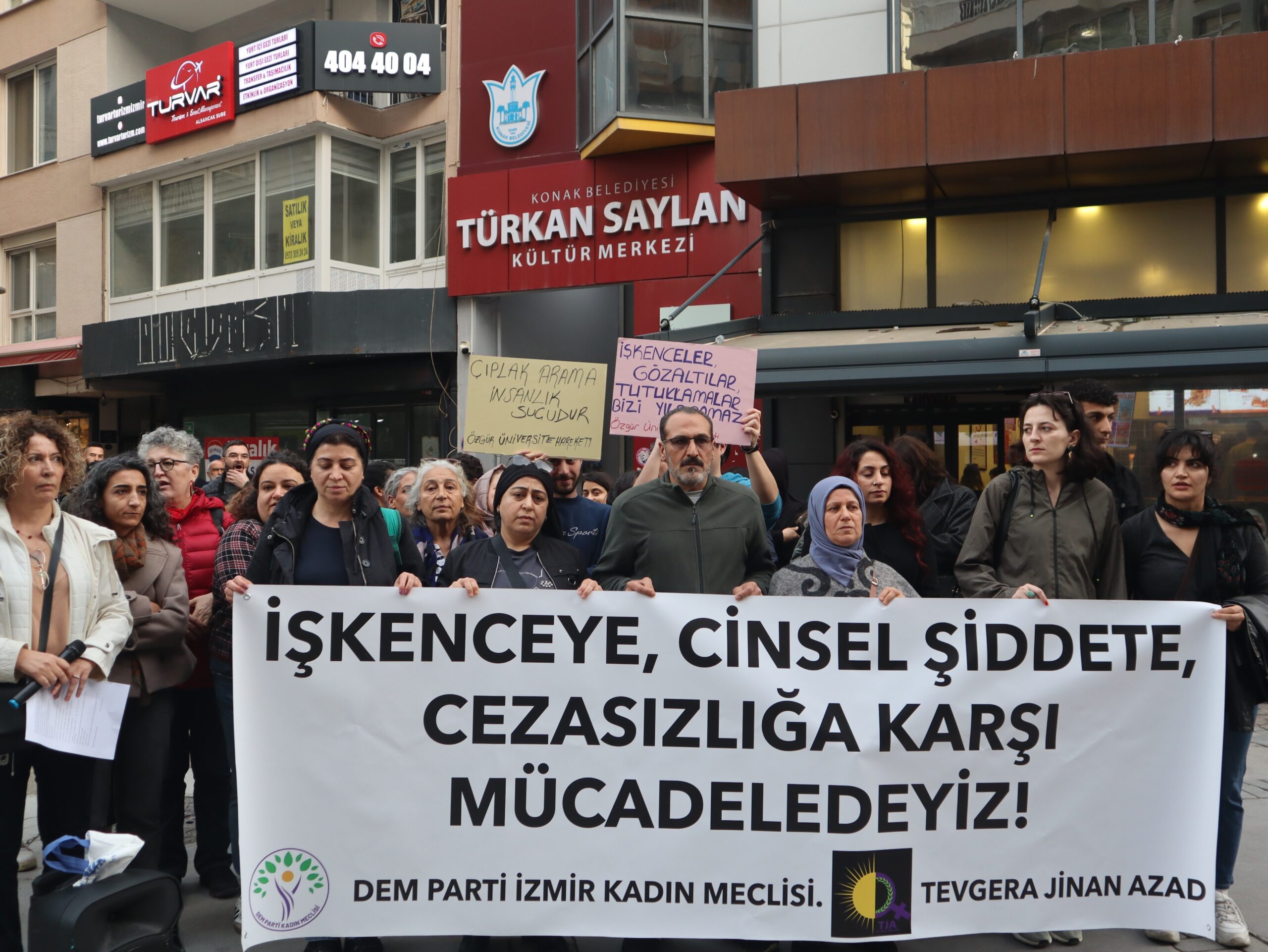 Meclîsa Jinan a DEM Partiyê û Tevgera Jinên Azad (TJA) li Îzmîrê derbarê girtina zarokên ku vîdeoya hûnandina por xwe parve kirin û hewldana tecawizê ya li dijî aktîvîstên ‘Karwana Gelan’ li ber Navenda Çandê ya Turkan Saylanê daxuyaniyek dan. Di daxuyaniyê de dirûşmên “Jin, Jiyan, Azadî”, “Dewlet destê xwe ji bedena me vekişîne”û “Dawî li lêgerîna tazî bînin” hatin berzkirin û pankarta “Li hemberî îşkence, tundiya zayendî û bêcezatiyê em têdikoşin” hate vekirin. Berdevka Meclîsa Jinan a DEM Partiyê Turkan Aslan Agaç daxuyanî xwend.