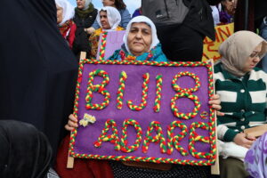 Piştî axaftina Gultan Kişanak jinan dirûşmeya “Bijî Serok Apo” berz kirin û çalakî bi dawî bû.