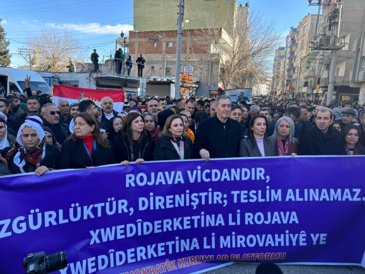 Hevserokên DEM Pariyê Tuncer Bakirhan û Tulay Hatimogullari bi boneya komkujiya li ser Rojava şermezar bikin civîna xwe ya komê li ser sînorê Nisêbînê li dar xistin. Bi deh hezaran kes beşdarî meşê bûn. Piştî meşê Hevserokan civîna xwe pêk anî.