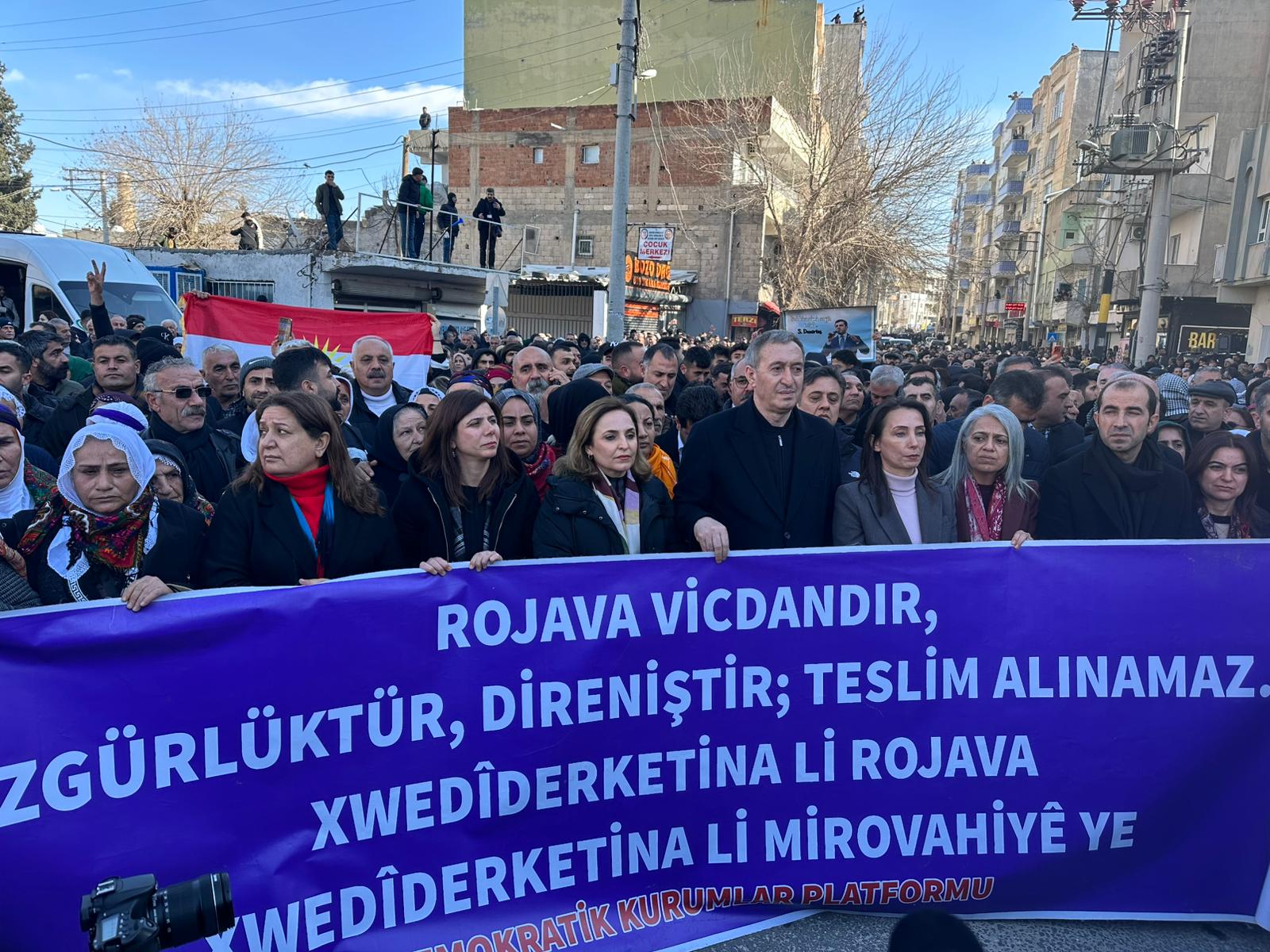 Hevserokê DEM Partiyê Tuncer Bakirhan jî axivî û wiha got: “Tenê partiya ku car caran civînên xwe li bajarên din li dijî nehehî û bêhiqûqiyê dike partiya me ye. Yên ku ev roj ava kirine em wan şermezar dikin. Li Bakur û Rojhilatê Sûriyeyê komkujî heye. Komên selefî bi dehan jin û zarokan dikujin. Yên van koman diparêzin, hêzên navdewletî wan diparêzin. Li Rojava Kurd bi tenê ne. Lê cîhan tev bûne yek. Cîhan li dijî Kuradan komkujiyê dikin. Dixwazin Kurd bê ziman, bê çand û bê ziman bijîn. Em wekî duh îro jî, li gel gelê Rojava yên ku ji bo ziman, çand û nasnameya xwe têdikoşin in.”