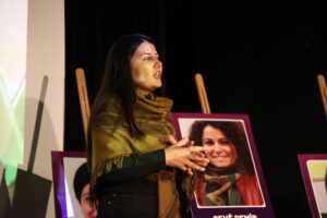 Dû re aktivîsta TJAyê Aynûr Sarica axivî û diyar kir ku jiyana azad û wekhevî bi dest û keda jinên li Kurdistanê derdikeve holê. Aynûr Sarica destnîşan kir ku ji ber vê yekê her tim hişmendiya mêr-dewlet êrişî jinên şoreşger ên Kurd dike û got: “Netewe-dewlet her tim êrişî jinan dike û dixwaze hişmendiya jinan têk bibe. Lê em ê li ser şopa xwedawendan bin û têkoşîna xwe bidomînin.”