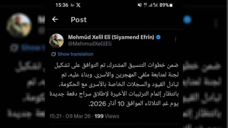 Xelîl li ser hesabê xwe yê Xê nivîsî ku “Di çarçoveya gavên koordînakirina hevbeş de li ser avakirina komîteya şopandina dosyayên koçber û dîlgirtiyan lihevkirin pêk hat. Li gorî wê, tomar û belgeyên taybet bi dîlgirtiyan bi hikumetê re hatin guherandin û li benda temamkirina tedbîrên dawîn in ku komeke din sibe (10 Adar 2026) were berdan.”