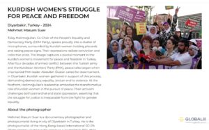 Wêneyekî ku ji aliyê wênegirê Kurd Mehmet Masum Suer ve di meha Gulanê ya borî de li Amedê di çalakiya “Aştiya Civakî û Çareseriya Demokratîk” de ku ji aliyê Tevgera Jinên Azad (TJA) ve hatibû organîzekirin, hatibû kişandin, di koleksîyona Global 50/50 de cih girt û li ser malpera rêxistinê hate weşandin. Di wêne de Hevseroka Giştî ya Partiya Wekhevî û Demokrasiyê ya Gelan (DEM Partî) Tulay Hatîmogûllari diaxive û li dora wê jinên Kurd ku bi tilîyen xwe nîşana serkeftinê rakirin e, xuya dikin.