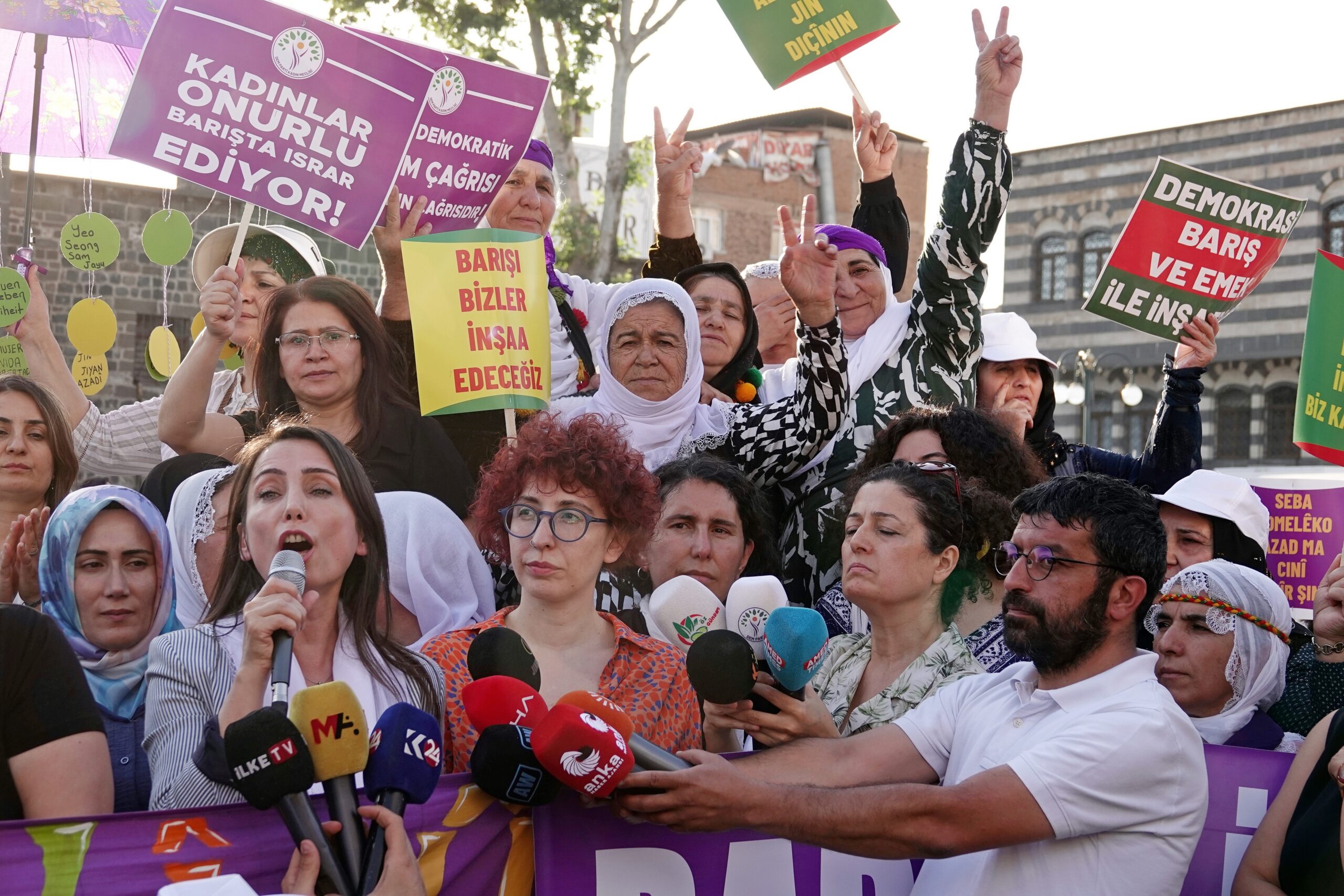 “Hevseroka Giştî ya Partiya Wekhevî û Demokrasiyê ya Gelan (DEM Partî) Tulay Hatîmogûllari bi serbilindî li pêşberî girseya ku ji aliyê jinên Kurd ve hatiye dorpêçkirin û pankart di destê wan de ne û nîşanên serketinê çêdikin, diaxive. Rûyê wan bawerî û serbilindiya kolektîf nîşan dide. Ev wêne kêliyek girîng di tevgera aştî û azadiyê ya jinên Kurd a li Tirkiyeyê de nîşan dide. Piştî çil salan şerê çekdarî di navbera artêşa Tirk û Partiya Karkerên Kurdistanê (PKK) de, bi banga bêçekbûnê û hevdîtinên aşîtiyê ya Rêberê PKKê Abdullah Ocalan dest pê kir. Li Amedê, jinên Kurd ji bo piştgiriya vê pêvajoyê hatin cem hev û daxwaza demokrasî, wekhevî û bidawîanîna tundîtûjiyê kirin. Hevserokatiya Hatîmogûllari rola veguherîner a jinên Kurd di lêgerîna aştiyê de temsîl dike. Aktîvîzma wan hem zilma baviksalar û hem jî ya dewletê dixe ber pirsê û diyar dike ku têkoşîna ji bo edaletê ji têkoşîna ji bo wekheviya zayendî nayê veqetandin.”