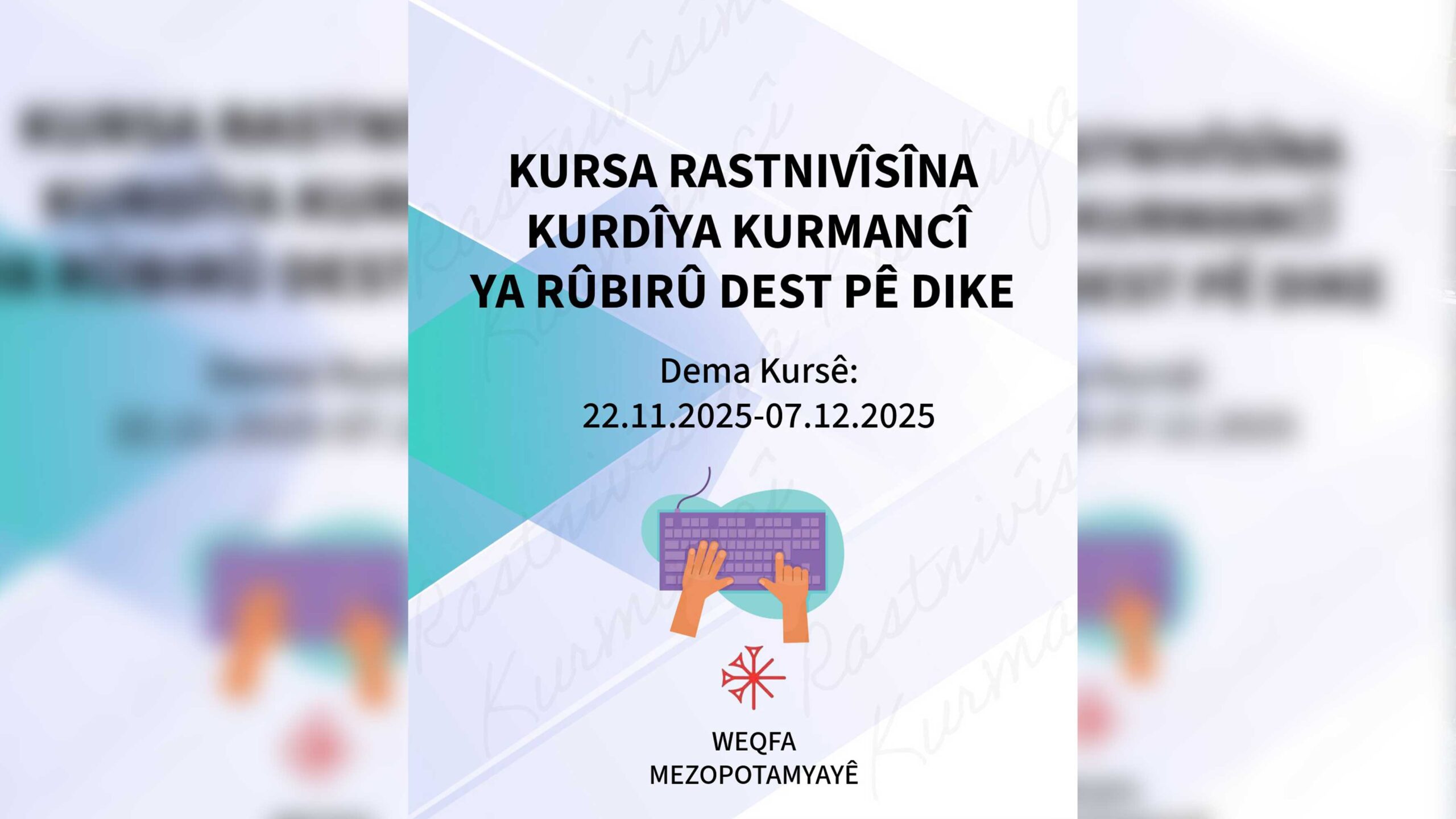 Weqfa Mezopotamyayê li Amedê li ser rastnivîsîna zaravayê kurmancî yê Kurdî kurseke bisertîfîka û rûbirû li dar dixe. Serlêdanên ji bo kursê dest pê kirine dê di 18ê Mijdarê de bi dawî bibin. Kurs dê bi 30 kesî sînorkirî be. Kursa ku dê di 22yê Mijdarê dest pê bike, dê di 7ê Kanûnê de bi dawî bibe. Weqfê lînka ji bo serlêdanê parve kir û wiha got: “Ji bo serlêdanê divê forma serlêdanê, bêyî kêmasî bê dagirtin. Ji bo ku hûn bikarin dagirin divê pêşî hûn qeyda endamtîya xwe li ser otomasyonê çê bikin. Ji bo qeyda endamtîyê lînkê bitikînin ‘http://online.wmezopotamyaye.org/'”