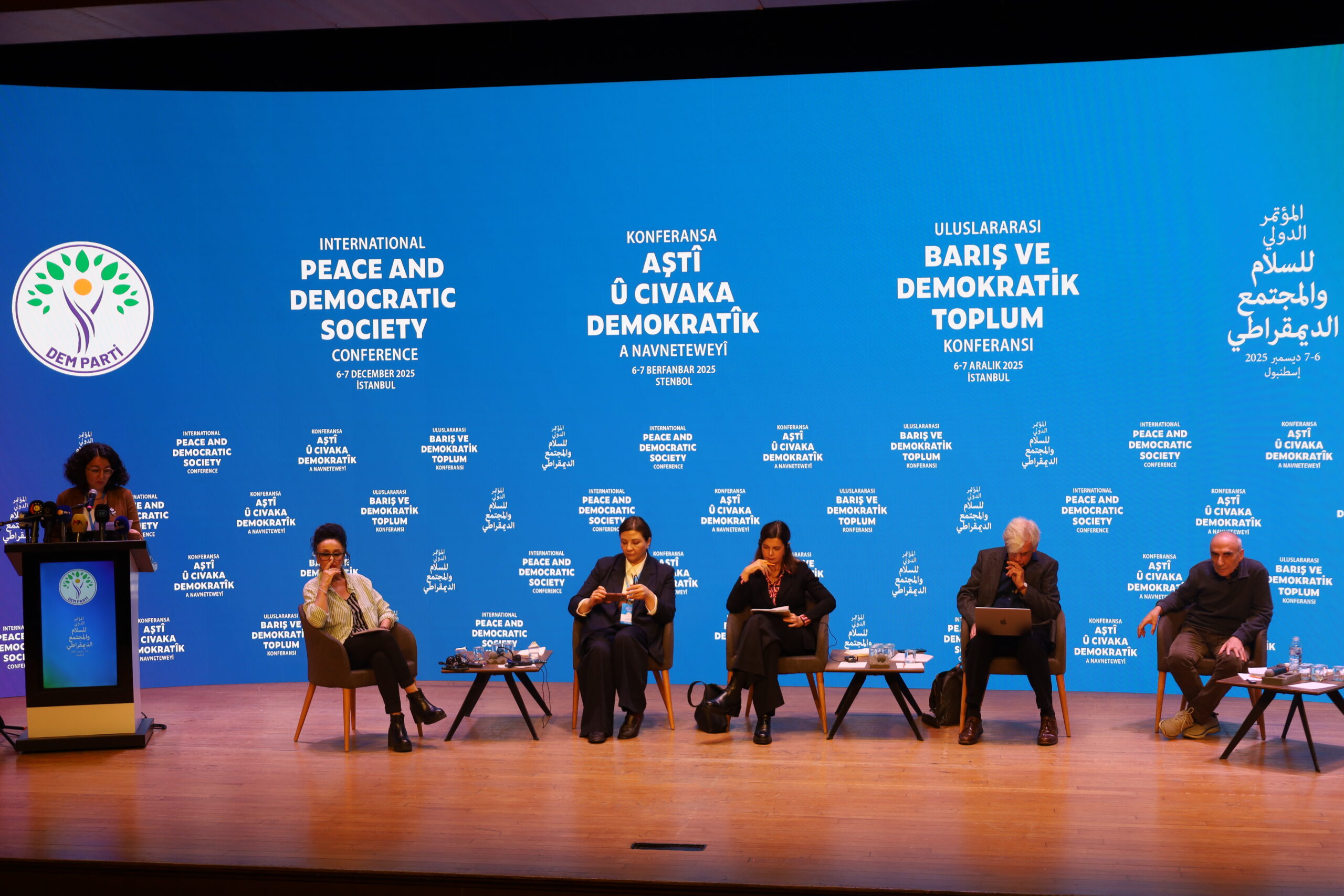 Ez hemû kesên ku ji bo Konferansa Aştî û Civaka Demokratîk a Navneteweyî li Stenbolê kom bûne û avakirina civakeke demokratîk, aştî û bi edalet armanc dike, tevan silav dikim. Di vê serdema ku di dîroka mirovahiyê de qeyrana herî kûr dijî de êdî aştî ji bo me û hemû gelên cîhanê